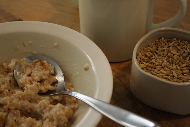 Menuen byder bl.a. på speltgrød med tørret hovtorn, ristede kerner og hyldeblomstsirup - vidunderligt og meget mættende.